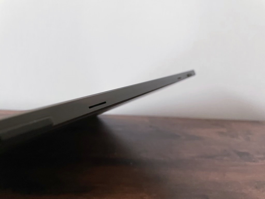 画面上と左右の極細フレームのおかげで、15.6インチと大画面ながら、コンパクトな印象を与えてくれます。中央下にロゴが若干気になるが、グレーで統一されたボディがカッコいい。