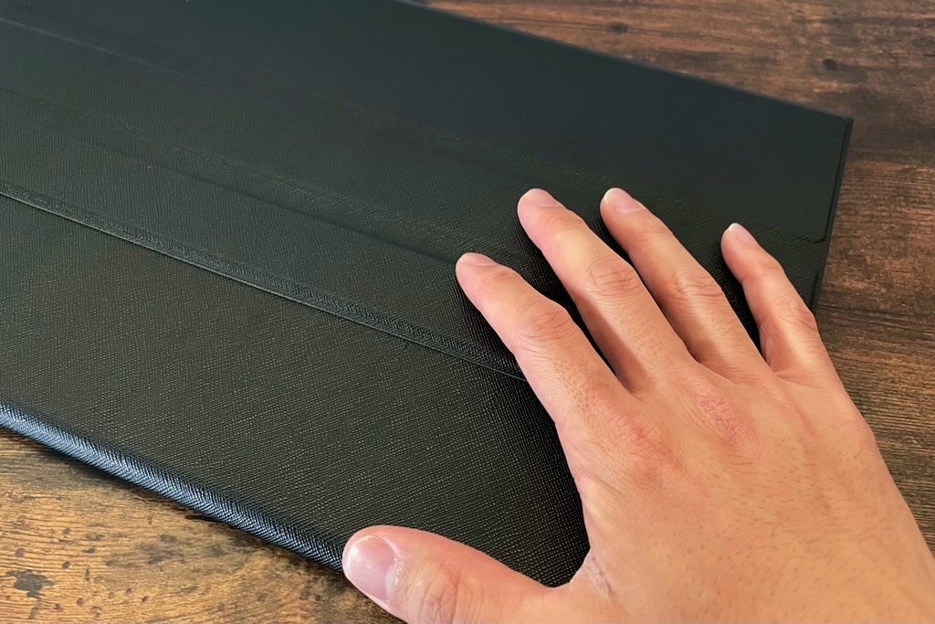 カバーをベロっと剥がして、折り畳み式のスタンドとして利用できます。段差が2つあり、ここにモニター本体を引っ掛けてスタンドさせます。