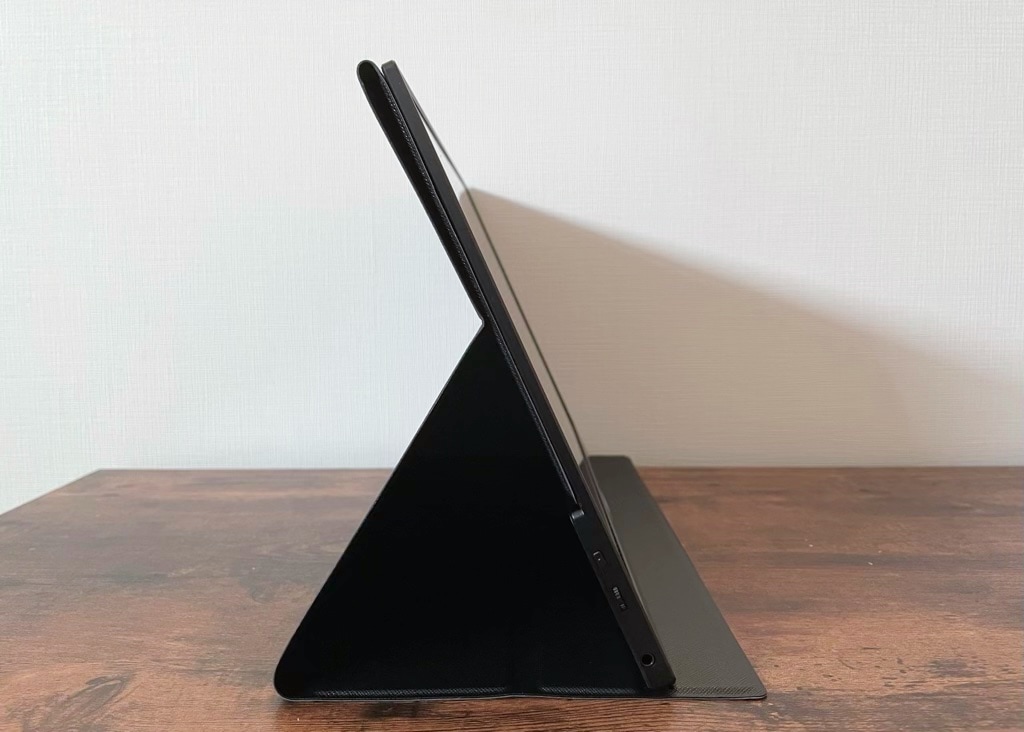 ▼本体とカバーはマグネットで固定されてます。横から見ると、モニター本体が丸見えです。