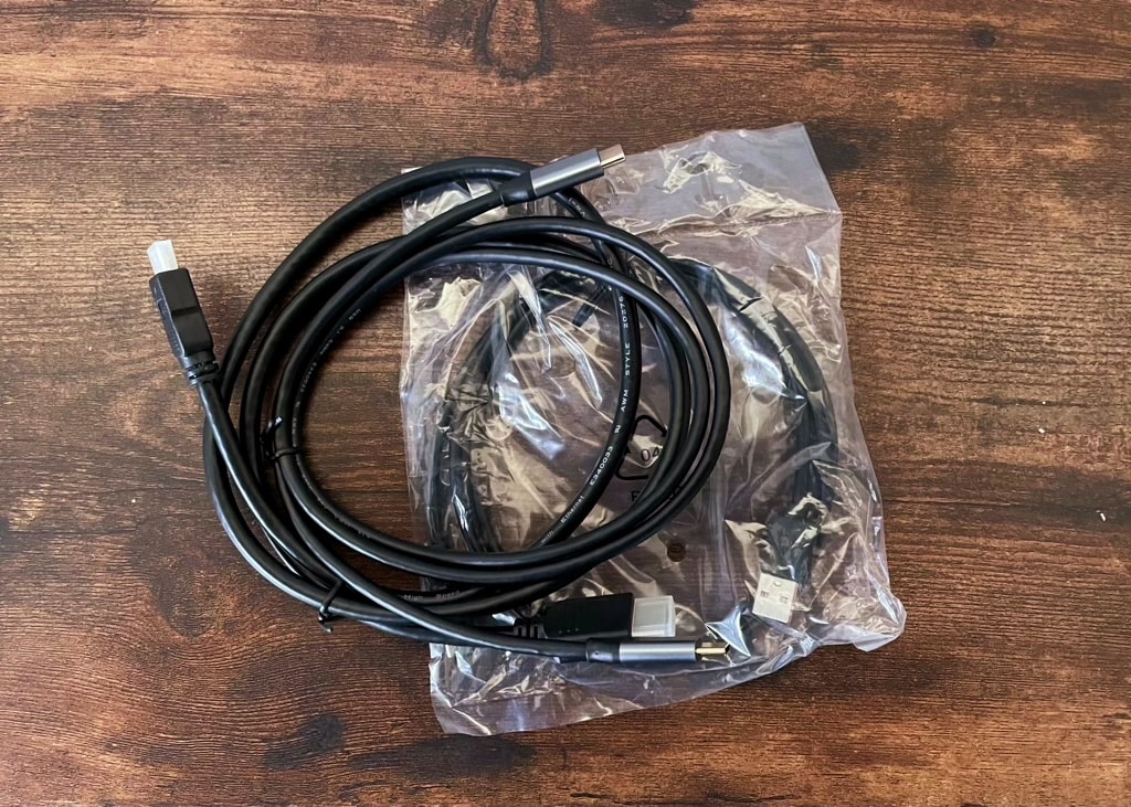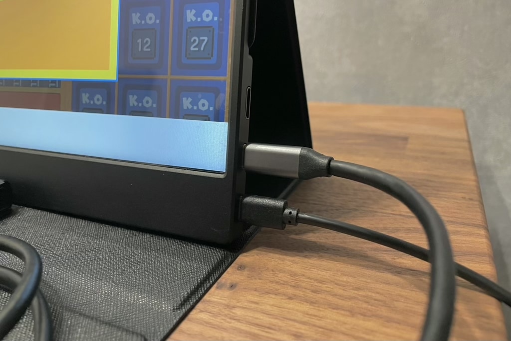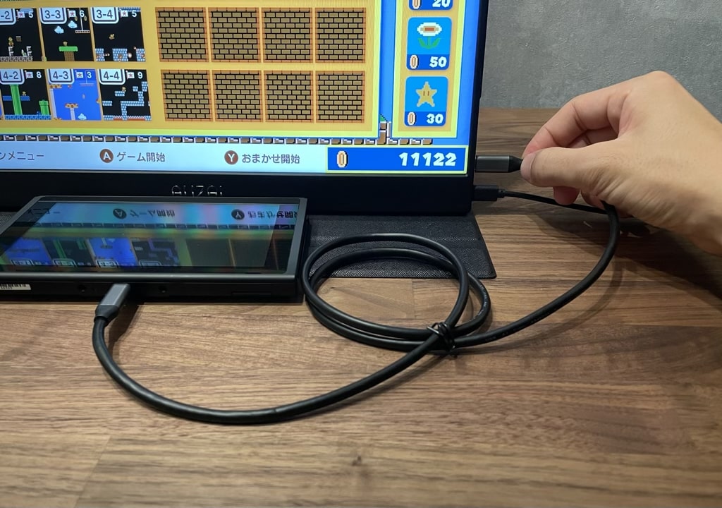 ただし、これだけではモニター側に電源供給ができないため、もう1本USB-Cケーブルでモニターに接続します。出力ワットが低いと画面が暗転するため、純正アダプタ同等の電力供給が必要です。
