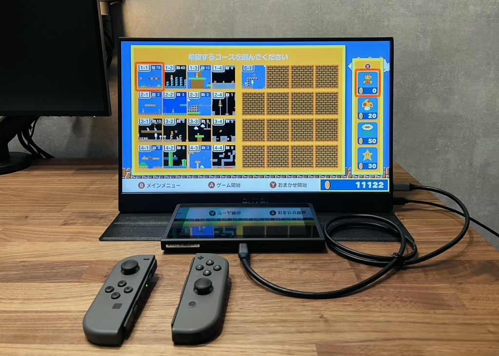 ME16とSwitch本体を直接USB-Cケーブルで接続すると、Switchの画面が暗くなり、モニターで遊べます。Switchドックが無くても使えるのが良いですね。