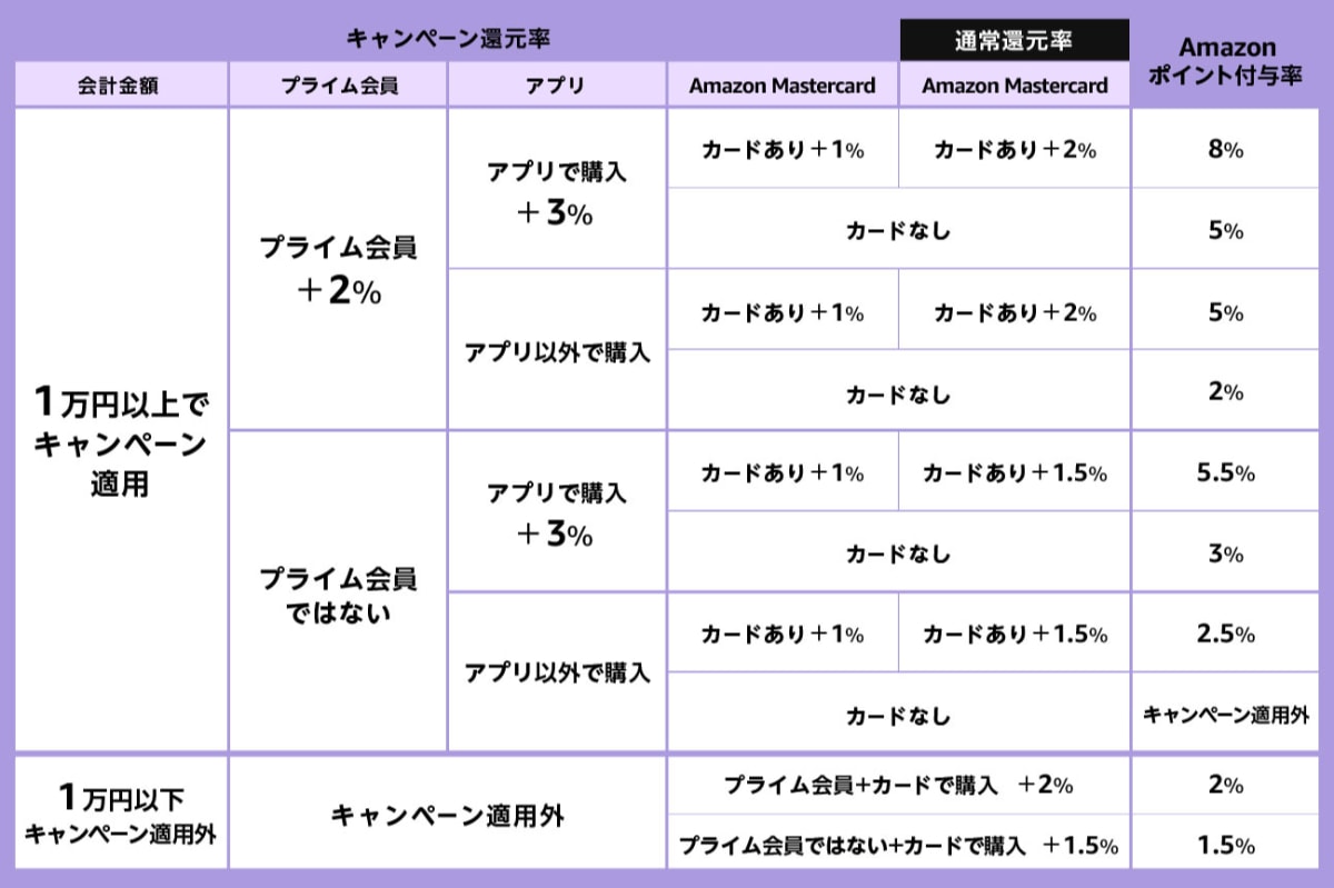 Kindle Unlimited、 Prime Video、Prime Musicなどの定額サービス料金(定額支払いではないデジタルコンテンツは対象)、Amazon提携ネットスーパー、Amazonギフト券、Amazonコイン、Amazonプライム会員の月会費・年会費、Amazon Mastercard会員の年会費、すべての手数料および配送費、ラッピング費用、予約商品も対象となりません。(キャンペーン細則)