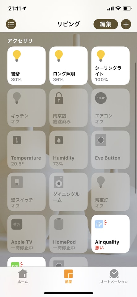 ▼うちのホームアプリの中身は、こんな感じで多くのHomeKitデバイスを揃えています。