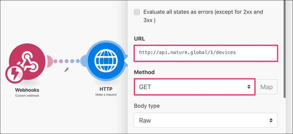 ▼WebhooksにHTTPモジュールを繋げて設定します。