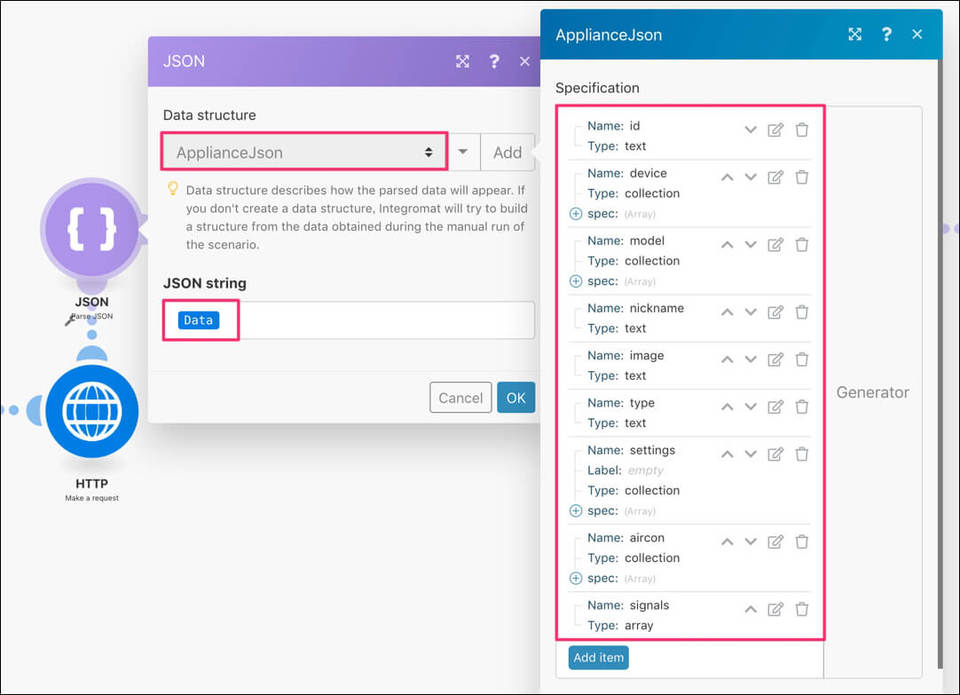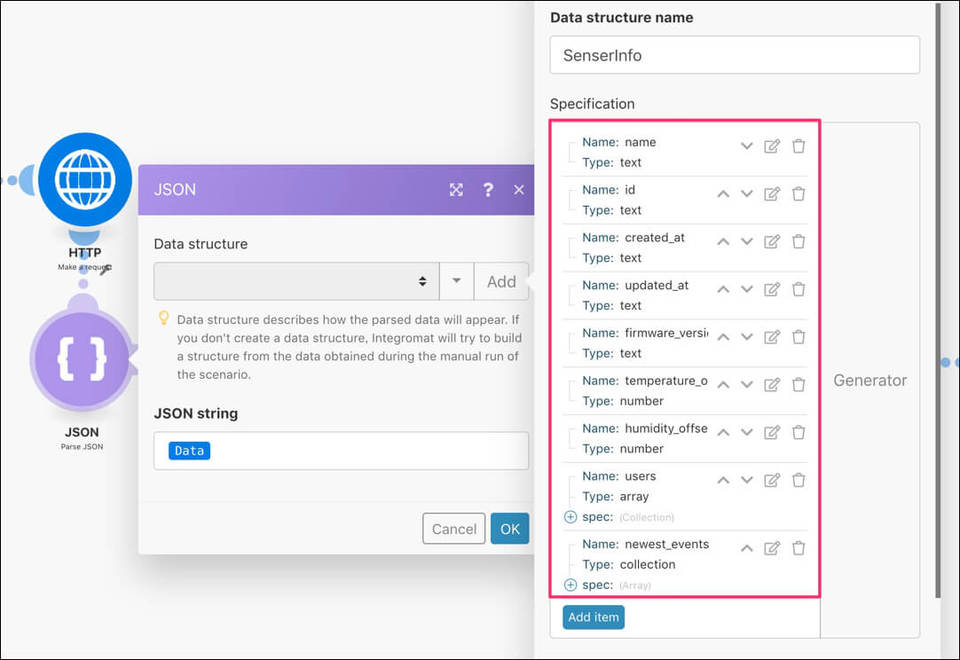 解析するJSONデータを指定する。上のHTTPモジュールから受け取る「Data」を選択。