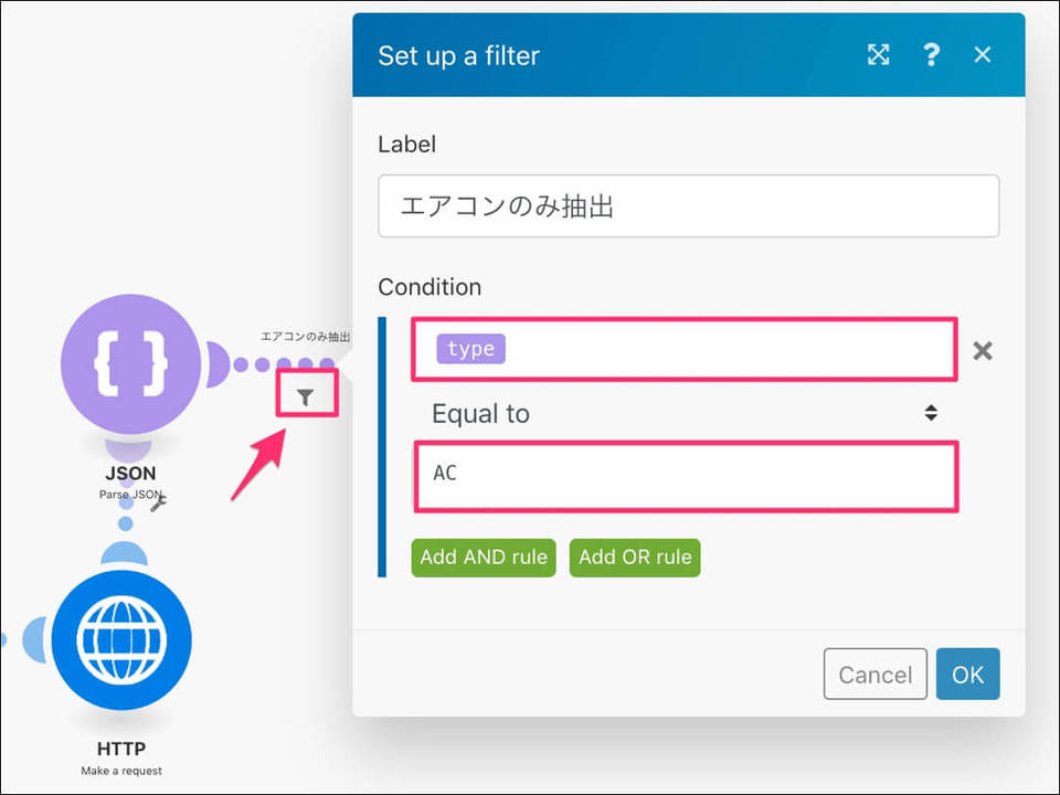 JSONデータにある「type」が「AC」のものがエアコン情報です。こうすることでリスト内から必要なデータだけを次の処理に流せます。