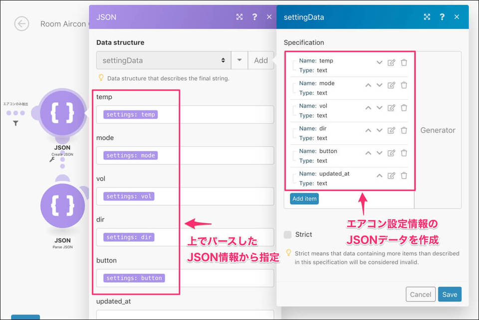 続いて、フィルターにて抽出したエアコン情報にある設定情報(温度、風量、ステータス)をJSONパースします。