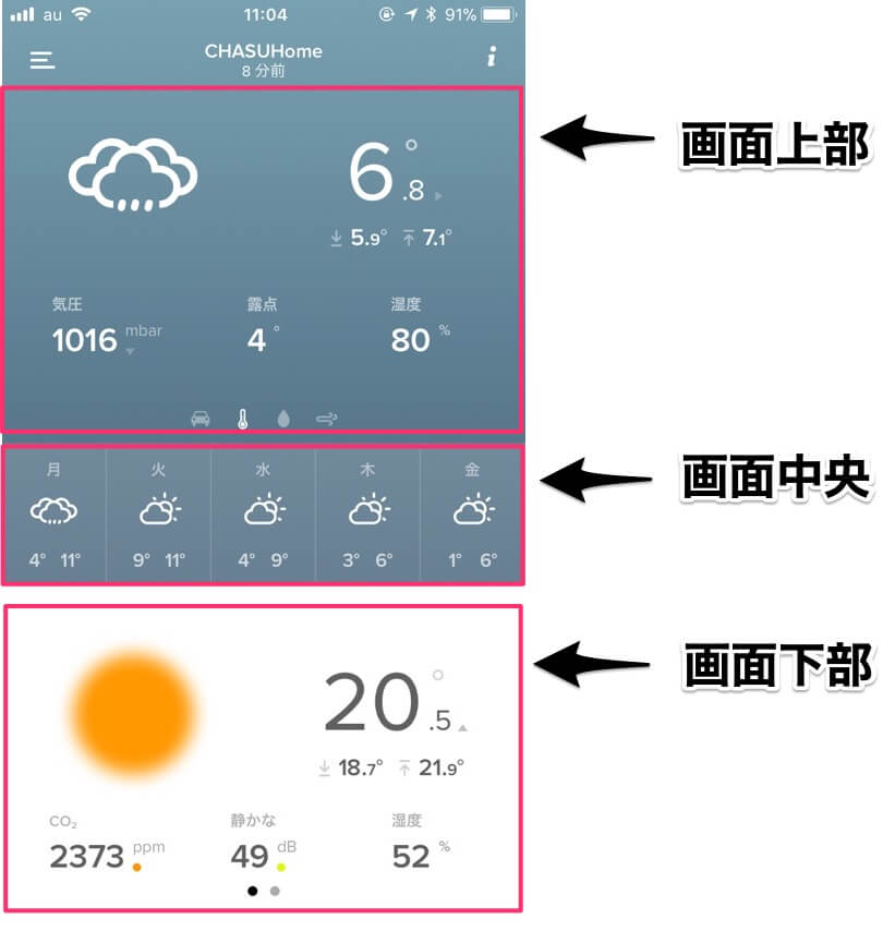 こちらはNetatmoからのリアルなデータです。屋外モジュールから「現時点の天気」「気温」「気圧」「体感/露点温度」「湿度」が確認できます。