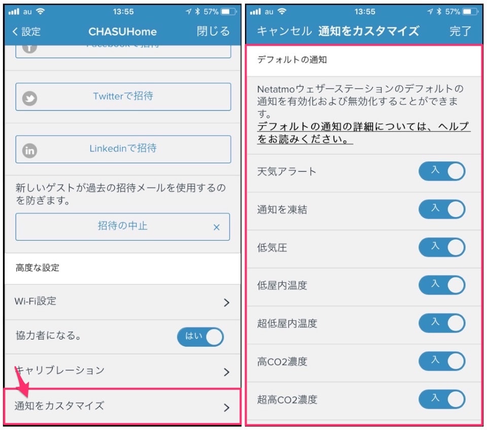 画像右では、NETATMO側の規定数値に基づいたデフォルトのプッシュ通知のオン/オフ設定です。上から2つ目の「通知を凍結」は文言は微妙ですが、凍結通知のことでオンにしておけば外気温が3度以下になると凍結状態を知らせてくれます。