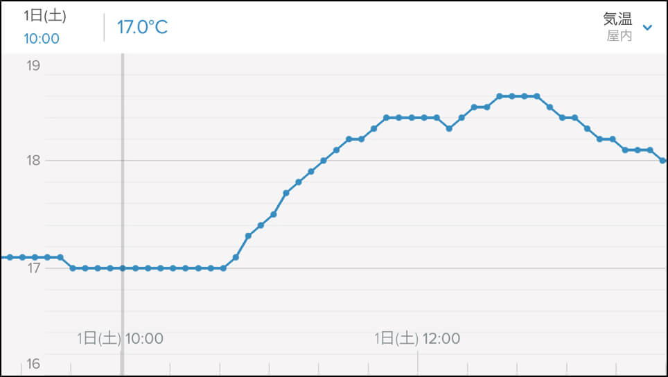 当たり前ですが、この数値は屋内で人が活動することで上昇します。我が家では、このCO2濃度を見える化してから空気の悪さにびっくりして、空気の入れ替えが習慣づいたくらいです!!