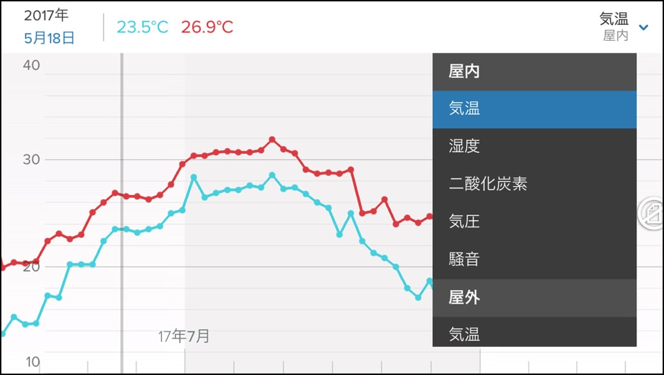 このように、アプリ起動中にデバイスを横向きにすることで、環境データをグラフ表示させることができます。