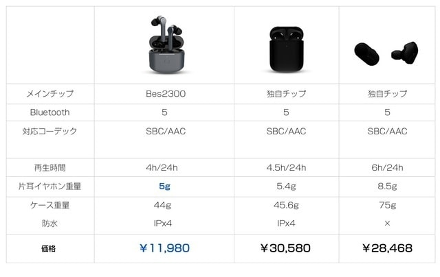▼製品ページにあった比較表です。ターゲットは、AppleのアレとSONYのあのイヤホンですね。