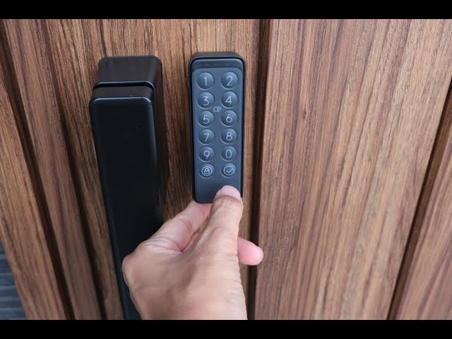 ▼ドアの外側に取り付け、1プッシュで施錠、ボタンをぽちぽちして解錠ができます。