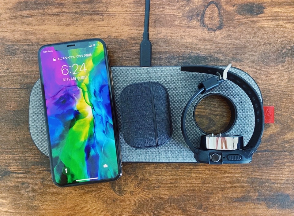 3台同時に充電できて、USB-C対応、MFi認証というのが他製品とは違うイイところ。ゴチャゴチャしてたケーブルがワイヤレスパッドに置き換わり、デスクの上がかなりスッキリした。